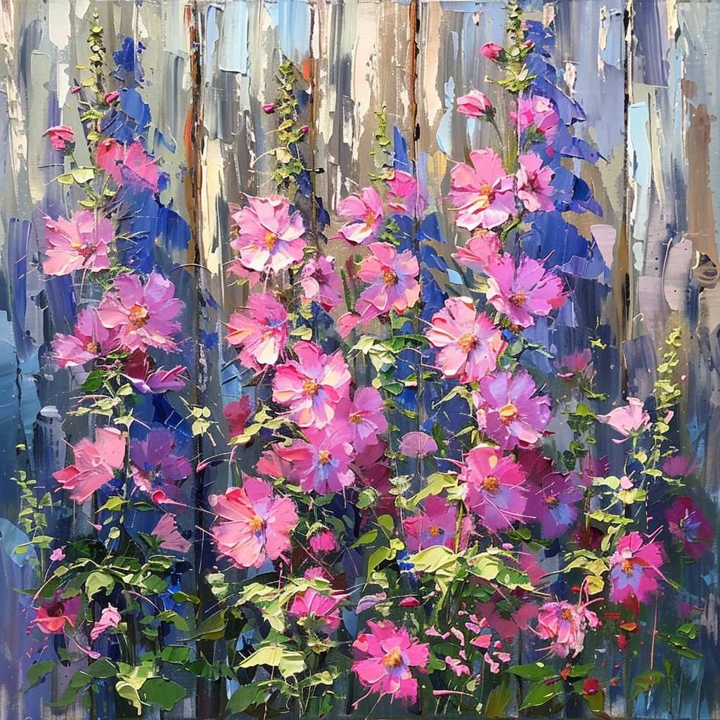 🖌 Every premium diamond captures the lush, layered hues of pink and purple hollyhocks, set against a weathered wooden fence that evokes warm, countryside nostalgia.🎨